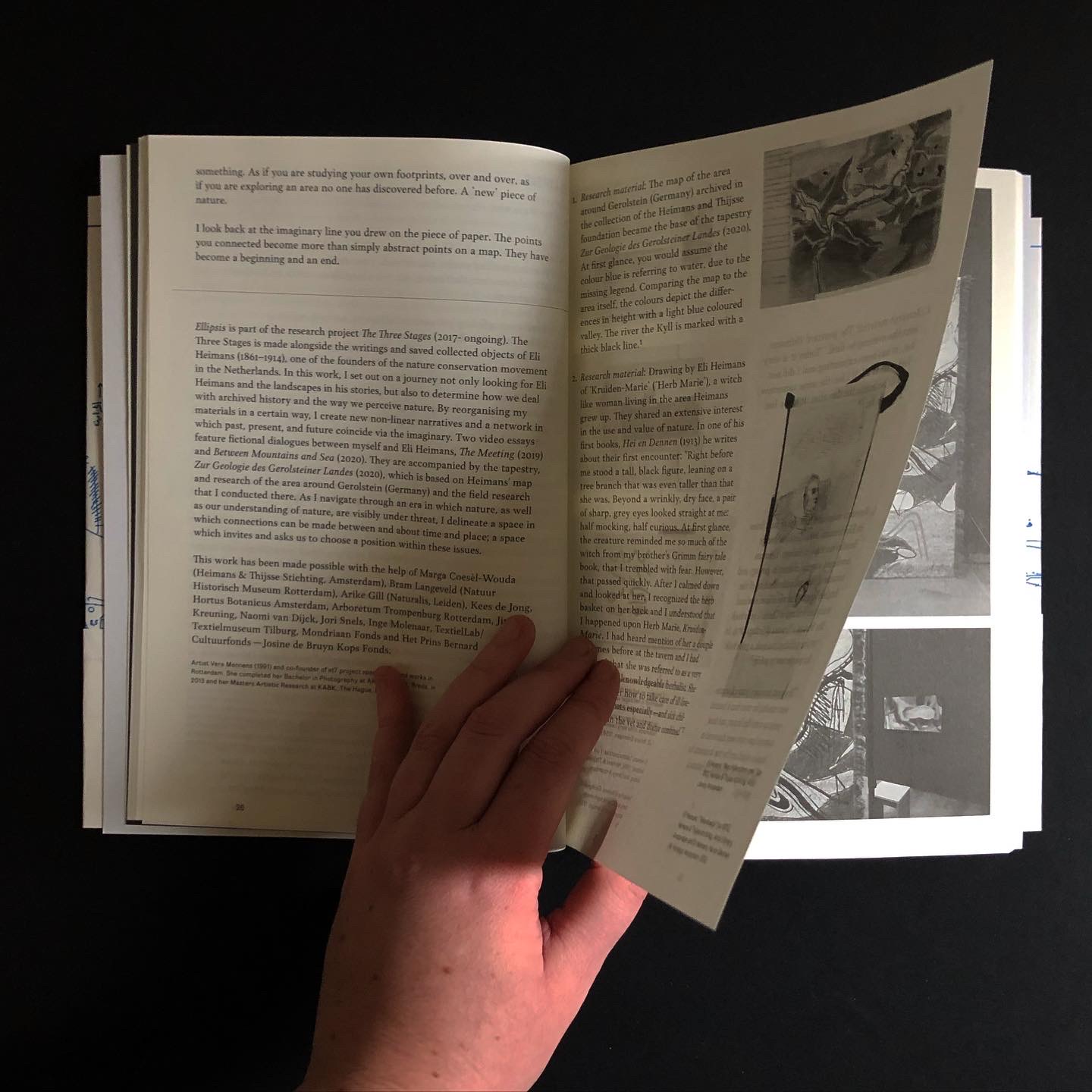 “Ellipsis” (2020) is based on fictional conversations with Eli Heimans during field research in Germany for the project The Three Stages (2017- ongoing), archival documents and the geographic maps incorporated in the tapestry Zur Geologie des Gerolsteiner Landes (2020). It was published in Tijdschrift Kunstlicht, VOL. 41 NO 2-3, 2020, WRITING NEW LEGENDS / (MIS)INTERPRETING MAPS.